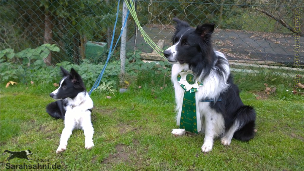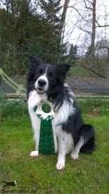 Jaimie übt für sein erstes eigenes Siegerfoto. Heute zusammen mit Border Button. Obedience-Prüfung beim HSV Menden.